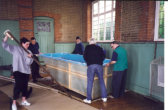 New Baptistry - Rev Eric and Terry Bibby helping New Baptistry is delivered - Terry Bibby in the middle First baptism in the new baptistry